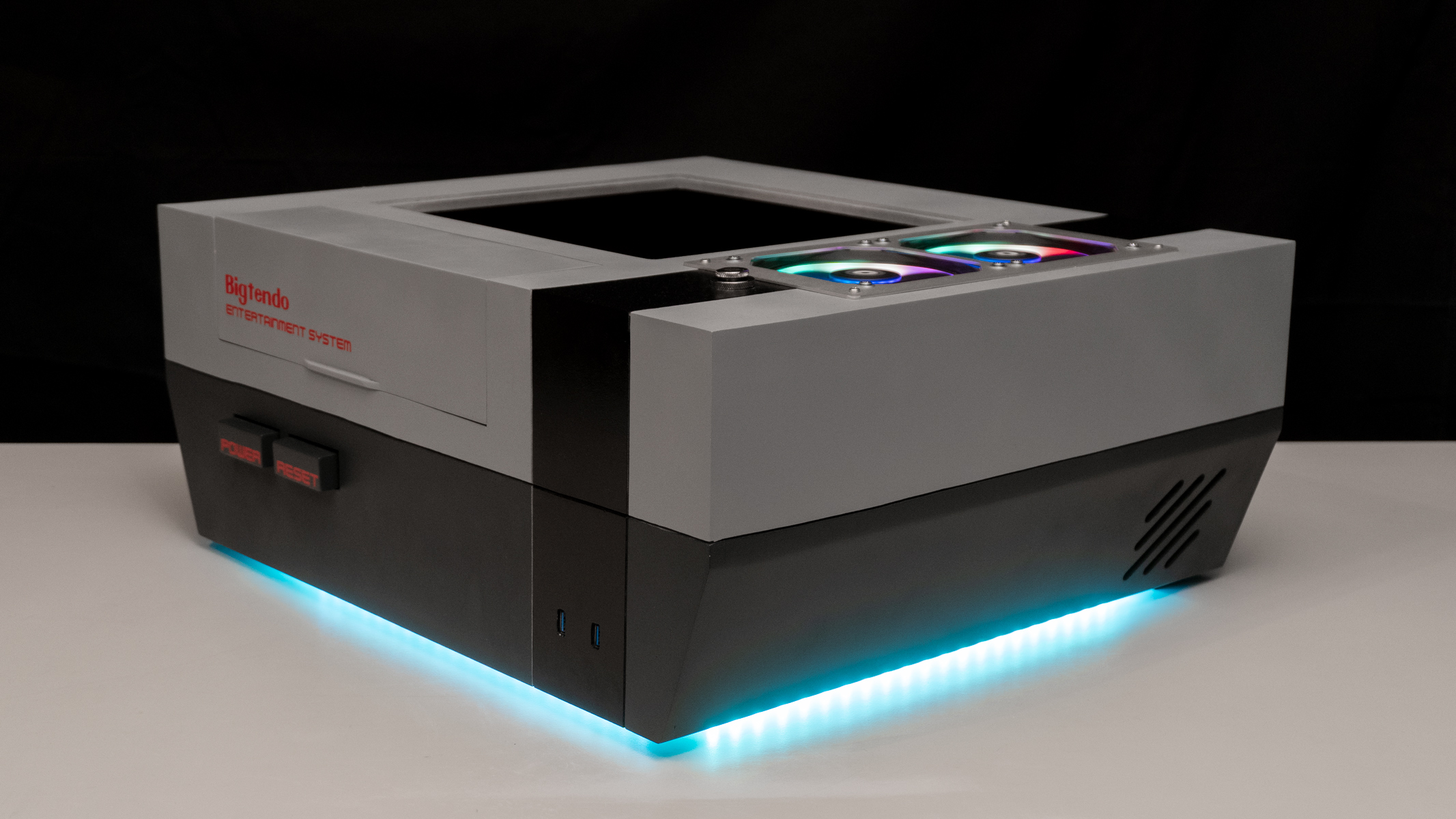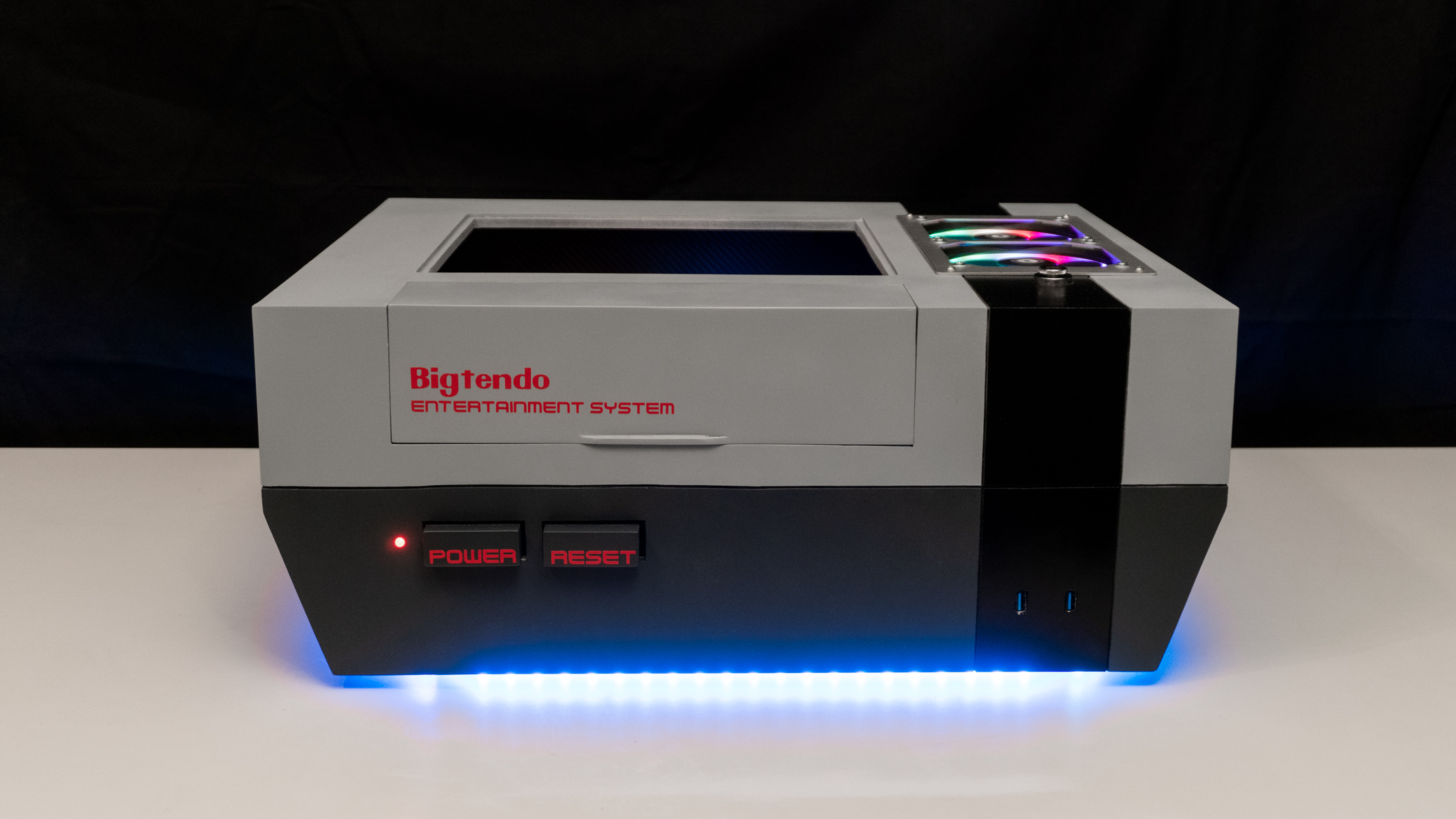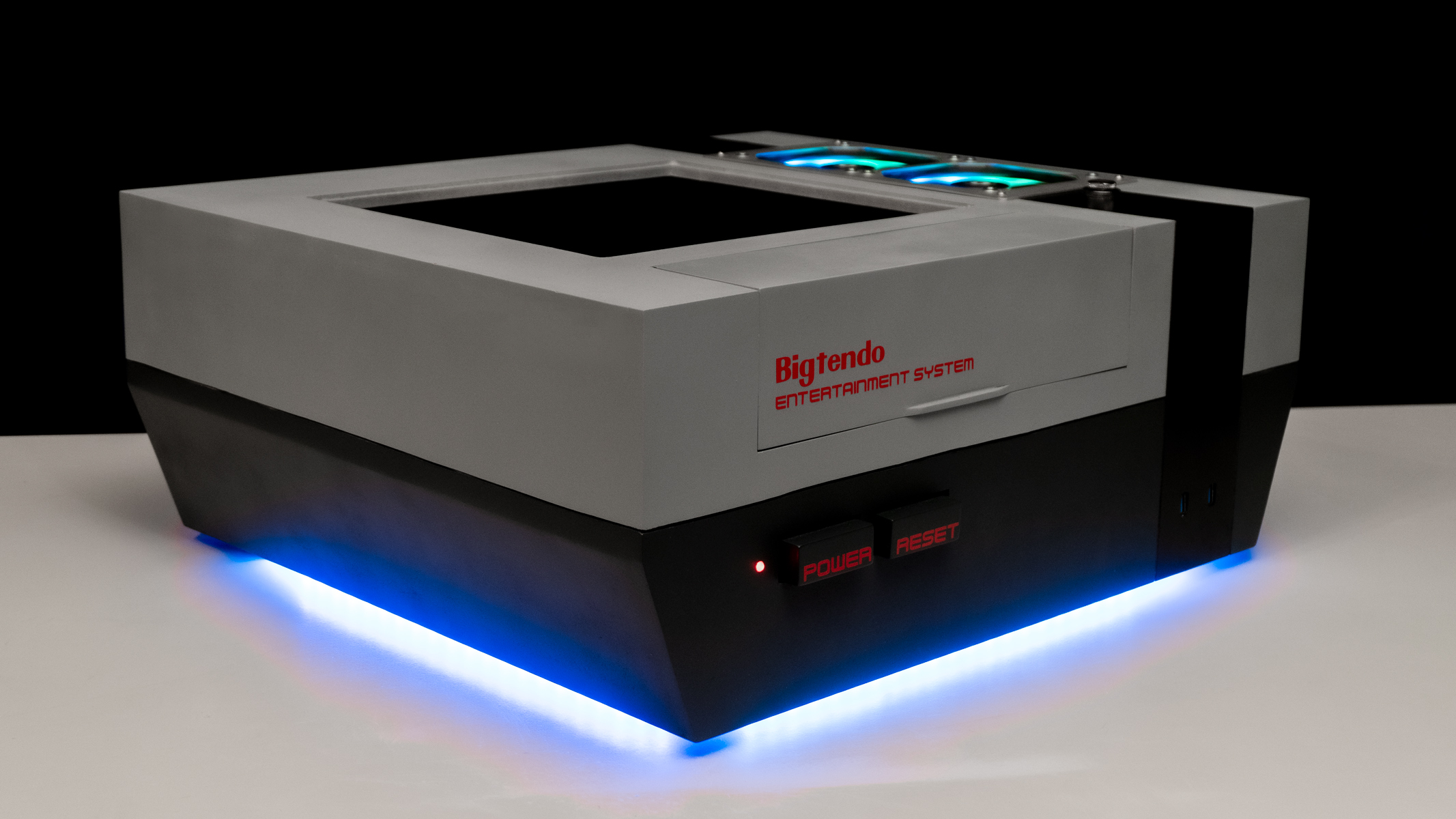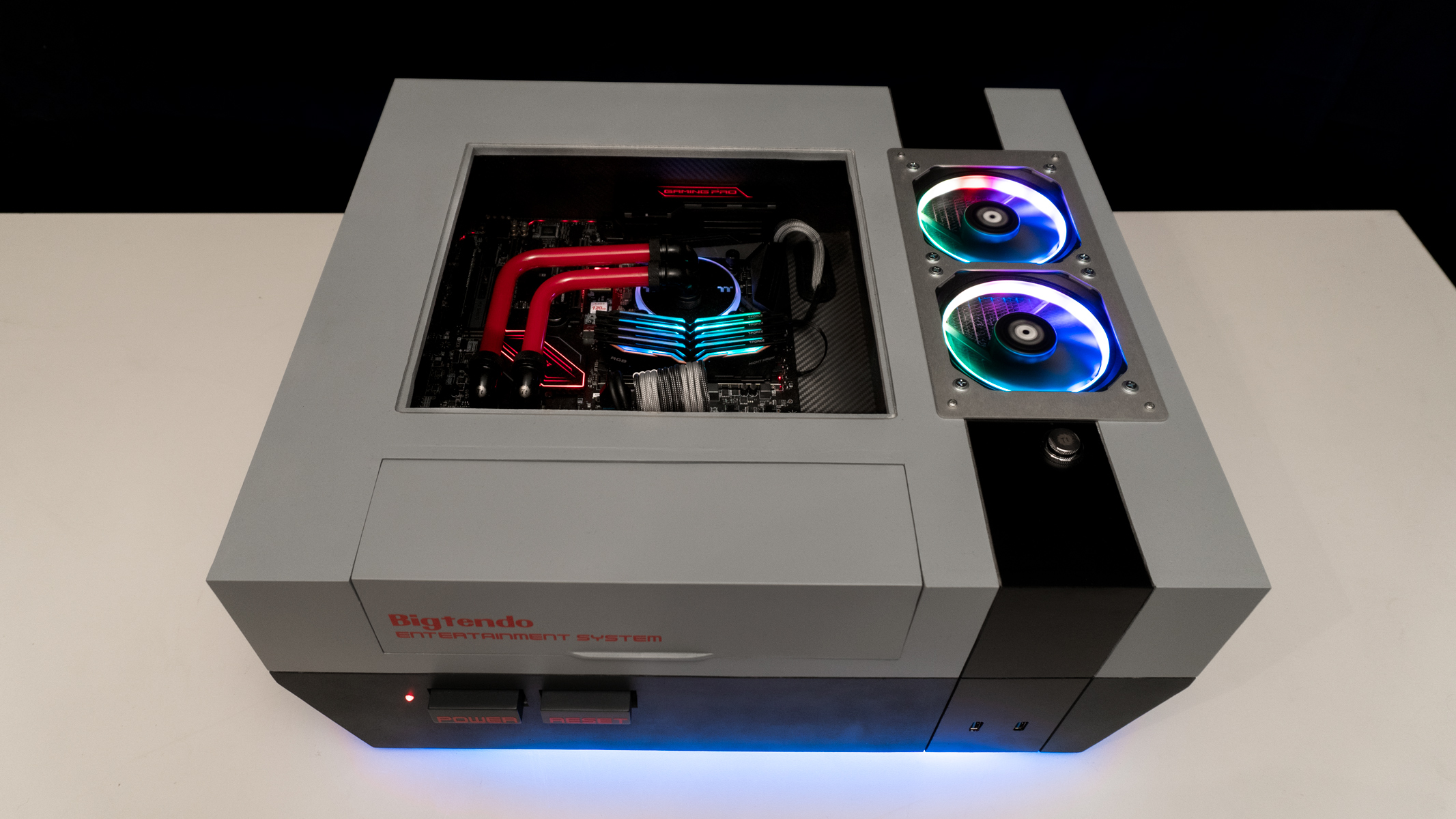 Bigtendo is a highly efficient PC with a customized water cooling in the look of the classical “Nintendo Entertainment System”. The super-sized controller is fully functional and can be used to play the good old games. The case was my third participation in the “24 h Live Modding” challenge at gamescom 2017 and became second place.